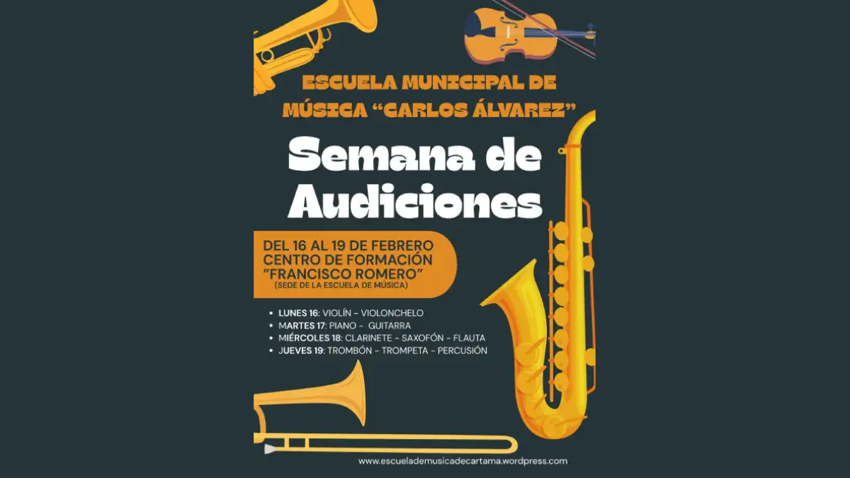 La Escuela Municipal de Música “Carlos Álvarez” de Cártama organiza su ciclo de audiciones instrumentales del 16 al 19 de febrero. Todo el alumnado, desde principiantes hasta avanzados, subirá al escenario en el Centro de Formación y Empleo Francisco Romero, sede habitual de estas citas.