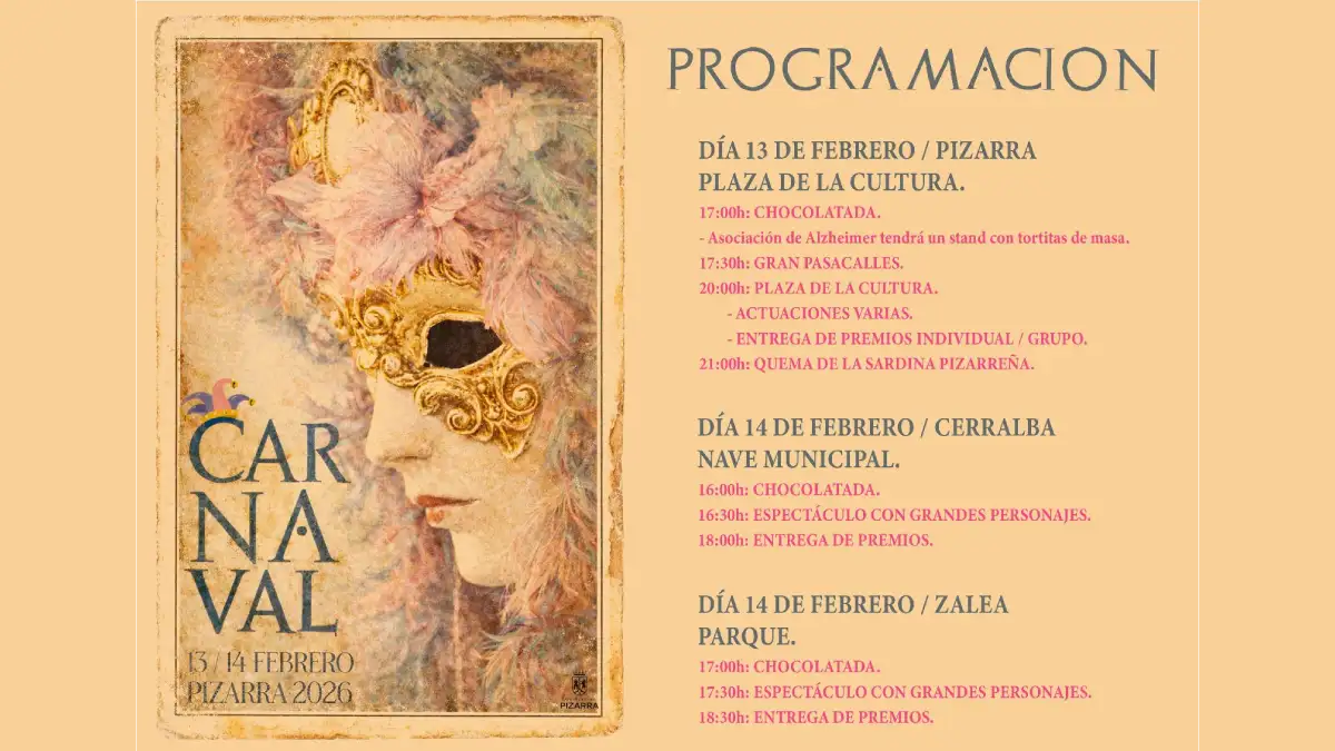 El Carnaval 2026 en Pizarra, Cerralba y Zalea ya tiene fecha y programa cerrado, y llega dispuesto a llenar de color un mes de febrero que, este año, viene cargado de ganas de calle y disfraces. El Ayuntamiento ha fijado el viernes 13 de febrero como día grande en la cabecera del municipio y ha reservado el sábado 14 para las barriadas, con actividades pensadas para público familiar, jóvenes y mayores. A partir de ahí, la Plaza de la Cultura, la nave municipal de Cerralba y el parque del recinto ferial de Zalea se convertirán en tres escenarios distintos de una misma fiesta. Chocolatadas, pasacalles, espectáculos infantiles y la tradicional quema de la Sardina Pizarreña marcarán el ritmo de un fin de semana que muchos vecinos ya tienen señalados en rojo en el calendario.