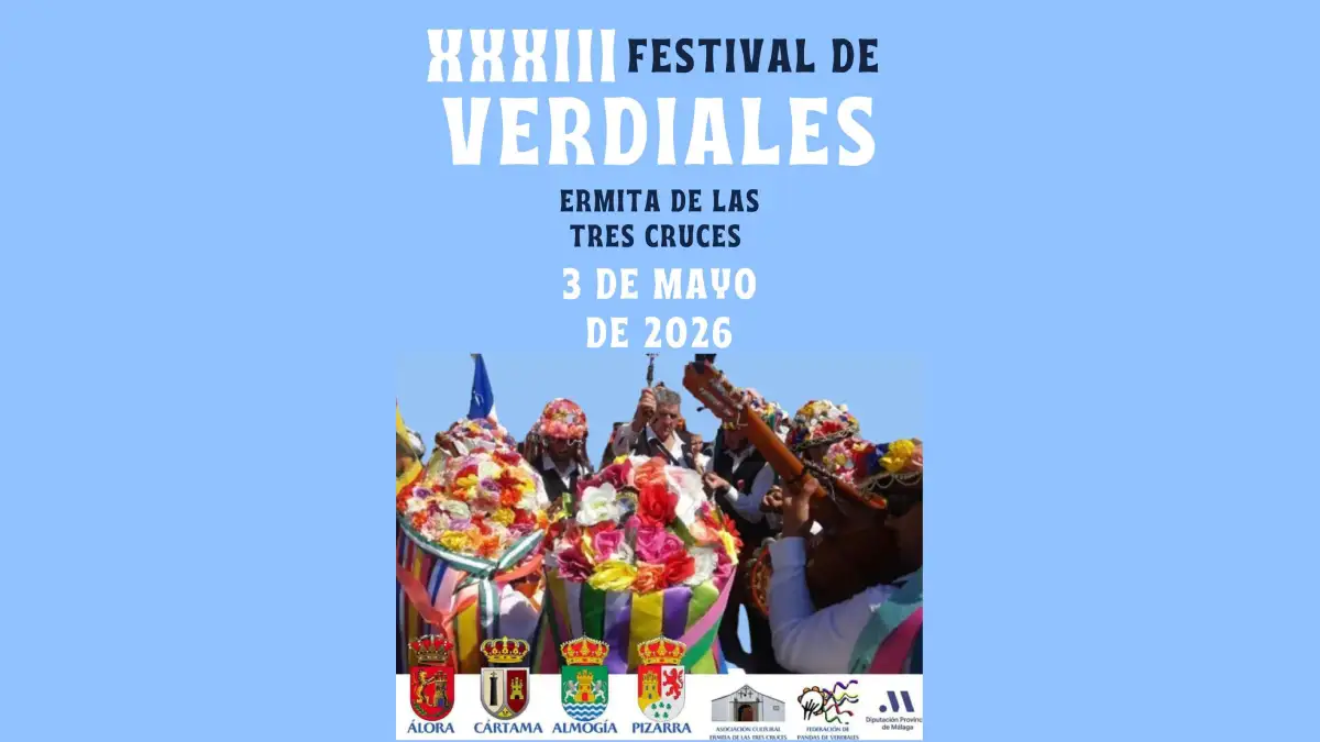 El próximo domingo 3 de mayo tendrá lugar el XXXIII Día de convivencia de Verdiales en la Ermita de las Tres Cruces, en el entorno de los municipios de Almogía, Álora, Cártama y Pizarra. La fiesta se consolida como una de las citas más esperadas del año en la comarca, declarada de Singularidad Turística Provincial y de Interés Turístico Nacional de Andalucía, y se estructura en torno a un largo paseíllo de pandas de verdiales, un acto institucional y el cambio de vara de mando entre ayuntamientos.