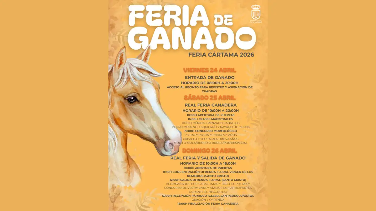 La Feria de Ganado Abril 2026 de Cártama se celebrará del 24 al 26 de abril junto al recinto ferial del municipio. Este evento, de gran arraigo en el Valle del Guadalhorce, reúne cada primavera a ganaderos, aficionados al mundo equino y visitantes de toda la comarca. Está orientado al público familiar y profesional que desea disfrutar de una feria tradicional donde conviven historia, trueques y pasión por los animales.
