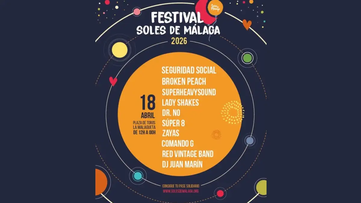 El Festival Soles de Málaga 2026 abre sus puertas el sábado 18 de abril de 12:00 a 00:00 en la Plaza de Toros La Malagueta. Este evento solidario reúne conciertos con artistas como Seguridad Social, Broken Peach y Lady Shakes para apoyar a entidades como AFESOL, Nuevo Futuro, Prolibertas, Betania y ALAS. Ideal para malagueños y visitantes que buscan música en directo, ambiente familiar y comida asequible en un espacio con zona de sombra y césped.