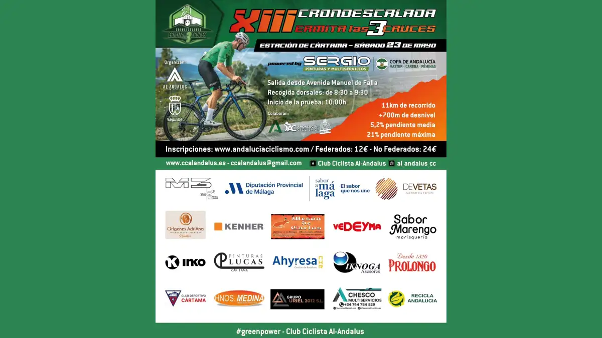 La 13ª Cronoescalada Pinturas Sergio de Cártama arranca el 23 de mayo de 2026 a las 10:00 en Cártama. Esta exigente prueba ciclista contra el crono sube hasta la Ermita de las Tres Cruces y puntúa para la Copa de Andalucía Máster, Féminas y Cadete-Juvenil (CAREBA). Dirigida a ciclistas federados y no federados en categorías desde cadete hasta máster 60, tanto femeninas como masculinas, el club AL-Andalus C.C. organiza el evento con límite de 200 participantes.
