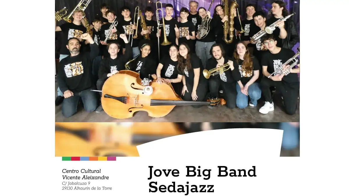 La Jove Big Band Sedajazz ofrece su concierto este viernes 27 de febrero a las 20:00 en el Centro Cultural Vicente Aleixandre de Alhaurín de la Torre. Esta formación de 23 jóvenesCentro cultural músicos presenta su álbum In Bloom con standards de jazz, funk, rock y latin jazz, tras actuar en festivales de Valencia, Barcelona y Almería. Ideal para amantes del jazz que buscan energía fresca y madurez instrumental en un entorno local accesible. Las entradas numeradas cuestan 5 euros y están a la venta en el centro o en www.mientrada.net.