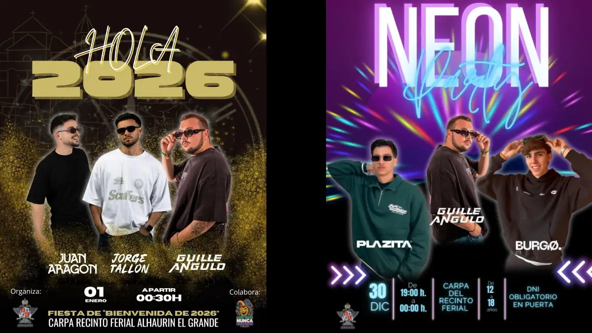Alhaurín el Grande despedirá 2025 y dará la bienvenida a 2026 con una doble cita festiva en la carpa del recinto ferial: la Neon Party para jóvenes el 30 de diciembre y la Fiesta Hola 2026 en la madrugada del 1 de enero. El Área de Fiestas del Ayuntamiento de Alhaurín el Grande ha diseñado dos propuestas diferenciadas por edades y horarios, con varios DJs al frente y un mismo objetivo: que la música y el ambiente no falten en el tramo final del año.