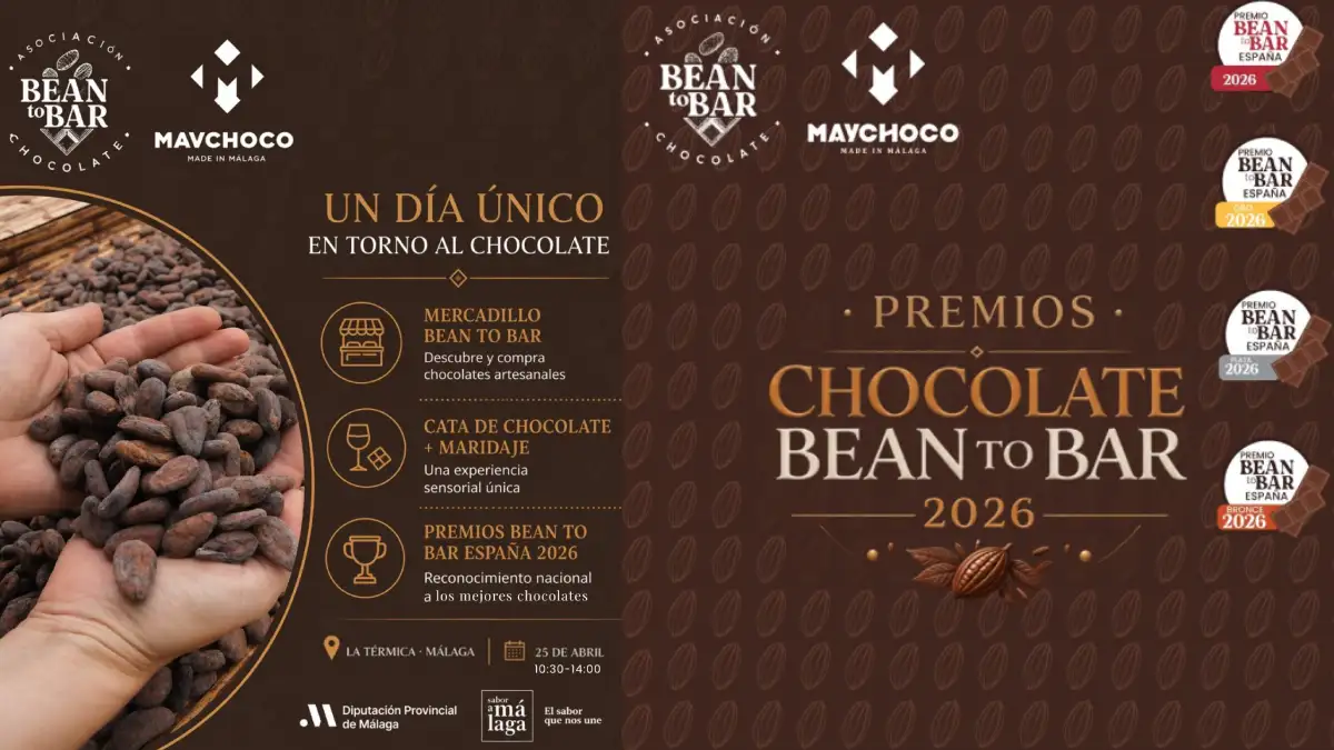 Los Premios Bean to Bar España 2026 se celebran este sábado 25 de abril en la Zona de Arcos de La Térmica, en Málaga. Organizados por Chocolates MayChoco con patrocinio de la Diputación de Málaga a través de Sabor a Málaga y La Térmica, el evento va dirigido a amantes del chocolate artesanal, familias y curiosos del buen cacao. De 10:30 a 14 h, con entrada libre, incluye mercadillo de chocolates de productores nacionales, cata maridaje y la entrega de premios a los mejores chocolates de España.