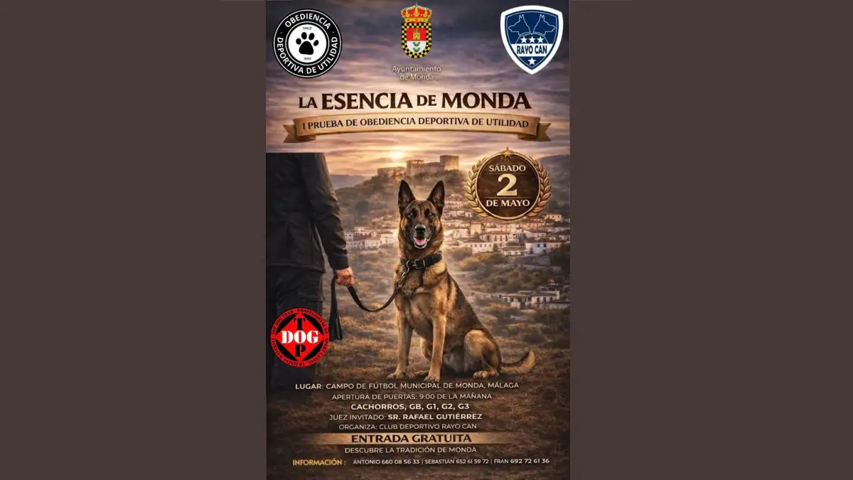 Monda acoge la I Prueba de Obediencia Deportiva de Utilidad “La Esencia de Monda” este sábado 2 de mayo de 2026 en el Campo de Fútbol Municipal “La Alpujata”. Esta cita de ámbito nacional reúne participantes de distintos puntos de España en categorías como cachorros, GB, G1, G2 y G3, con apertura de puertas a las 9 h y entrada gratuita. Organizada por el Club Deportivo Rayo Can, atrae a familias, aficionados al deporte canino y visitantes que buscan disciplina, competencia y buen ambiente en un enclave natural de la comarca.