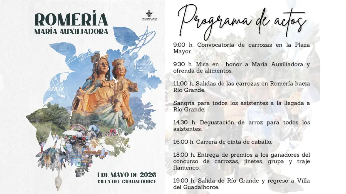 El día arranca a las 09:00 h con convocatoria de carrozas en la Plaza Mayor de Villa del Guadalhorce, seguida de misa a las 09:30 h y ofrenda de alimentos en honor a María Santísima Auxiliadora. A las 11:00 h sale la romería hacia Río Grande, donde se ofrece sangría a los asistentes al llegar.