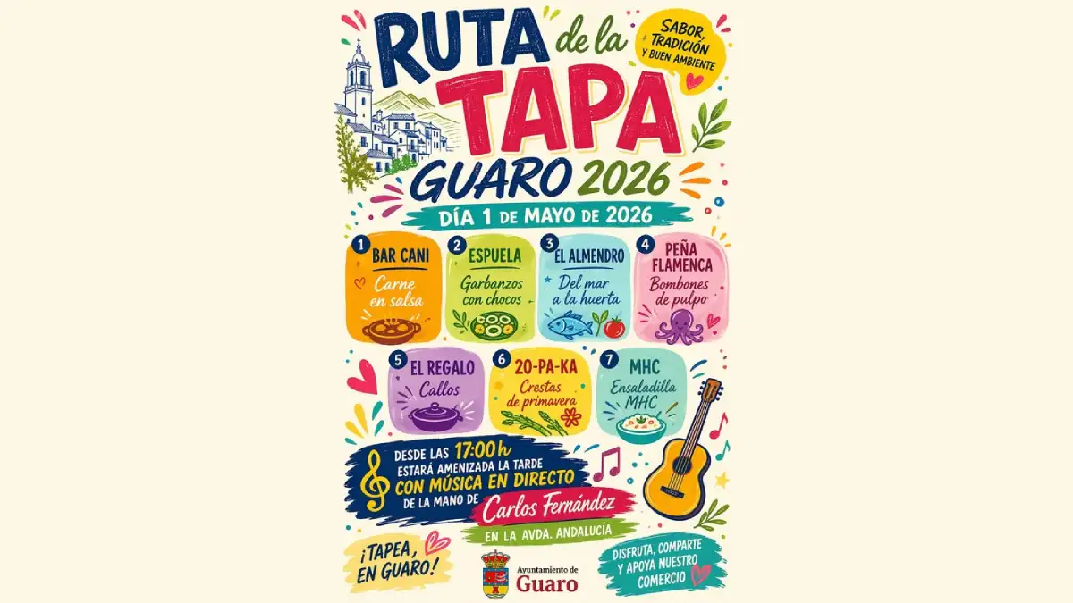 El Ayuntamiento de Guaro organiza el evento para fomentar la participación vecinal y el consumo local. La actividad principal arranca con las tapas disponibles durante el día y culmina con música en directo de Carlos Fernández a partir de las 17:00 h. Es una oportunidad para recorrer el corazón de Guaro, un pueblo serrano de la comarca de la Sierra de las Nieves conocido por su ambiente acogedor y productos de proximidad.