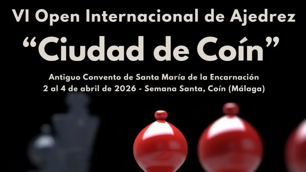 Coín vibra con el ajedrez. El VI Open Internacional de Ajedrez Ciudad de Coín Sub2400 comienza hoy, jueves 2 de abril, en el Antiguo Convento de Santa María de la Encarnación. Más de 130 jugadores han agotado el aforo, listos para siete rondas intensas hasta el sábado. Organiza el Club Ajedrez Coín, dirigido por Miguel Jiménez, con arbitraje de Juan Francisco Gaspar Ruiz.