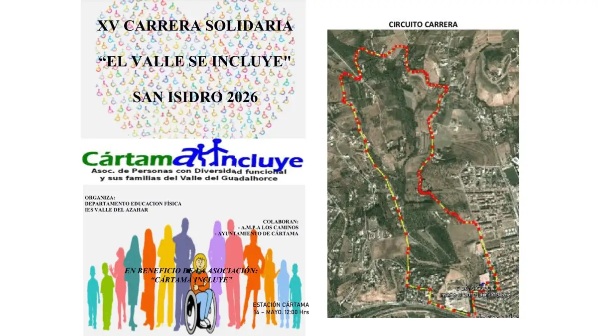 La XV Carrera Solidaria “El Valle se Incluye” arranca el jueves 14 de mayo de 2026 a las 12:00 horas desde la puerta del IES Valle del Azahar en Estación de Cártama. Organizada por este instituto a beneficio de la Asociación Cártama Incluye, recorre 5400 metros con salida y llegada en la pista de fútbol sala del centro. Está dirigida a alumnos de ESO, FPB, Bachillerato, Ciclos Formativos y corredores senior y veteranos de la zona.