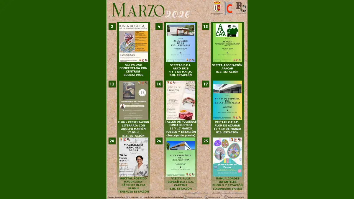 El alumnado de la Escuela Infantil Arco Iris abrirá el calendario los días 4 y 5 de marzo con una visita matinal. Más adelante, el 13 de marzo, la Asociación de Familiares de Enfermos de Alzheimer y otras Demencias de Cártama (AFACAR) realizará una jornada adaptada a sus usuarios. Ese mismo día, a las 17.00 h, el Club de Lectura “Alazor” volverá a encontrarse en la biblioteca de Cártama Estación.