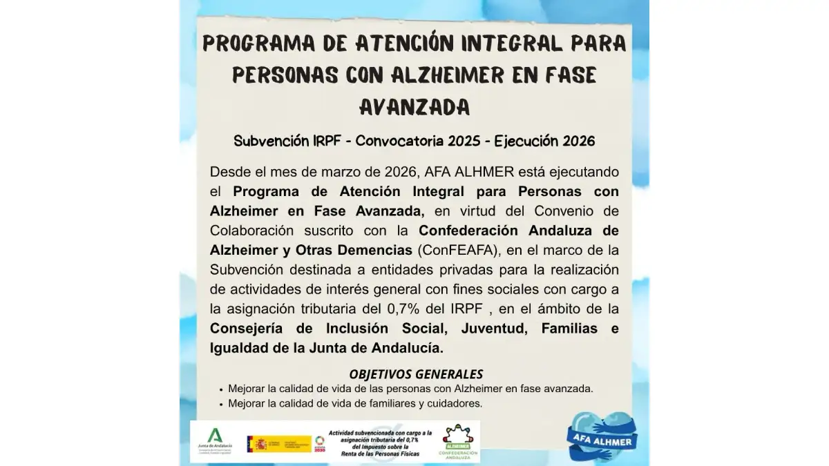 Desde marzo de 2026, AFA ALHMER en Alhaurín el Grande ejecuta el Programa de Atención Integral para Personas con Alzheimer en Fase Avanzada. Este iniciativa surge del convenio con la Confederación Andaluza de Alzheimer y Otras Demencias (ConFEAFA), en el marco de la subvención del 0,7% del IRPF de la Consejería de Inclusión Social, Juventud, Familias e Igualdad de la Junta de Andalucía.