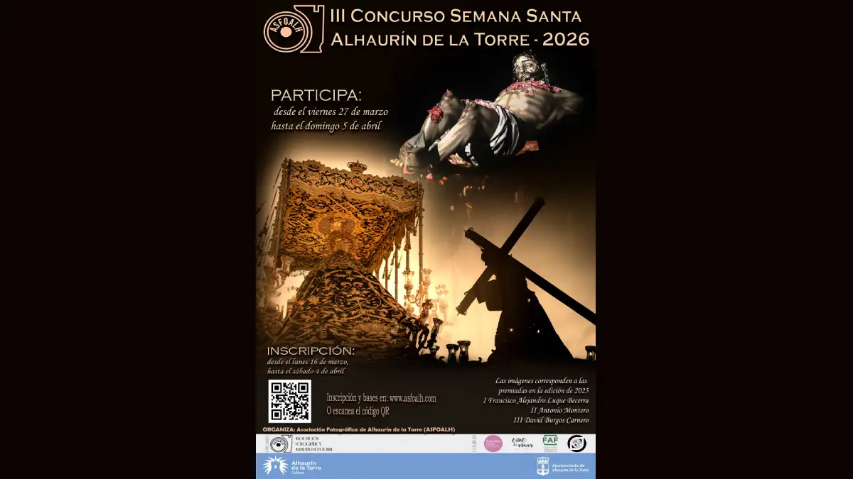 El Ayuntamiento de Alhaurín de la Torre, a través del Área de Cultura, colabora con Asfoalh y La Platea en la tercera edición del Concurso Fotográfico ‘Semana Santa de Alhaurín de la Torre 2026’. Se repartirán 600 euros en premios: 300 al ganador, 200 al segundo y 100 al tercero.