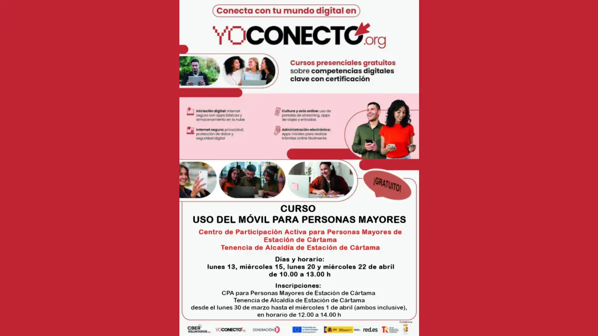 Las inscripciones estarán abiertas del 30 de marzo al 1 de abril en el CPA, de 12.00 a 14.00 horas. El taller se enmarca en el programa “yoconecto.org”, impulsado por la Fundación Cibervoluntarios dentro de la iniciativa Generación D, que promueve Red.es y el Ministerio para la Transformación Digital y de la Función Pública, con colaboración del Área de Bienestar Social del Ayuntamiento de Cártama.