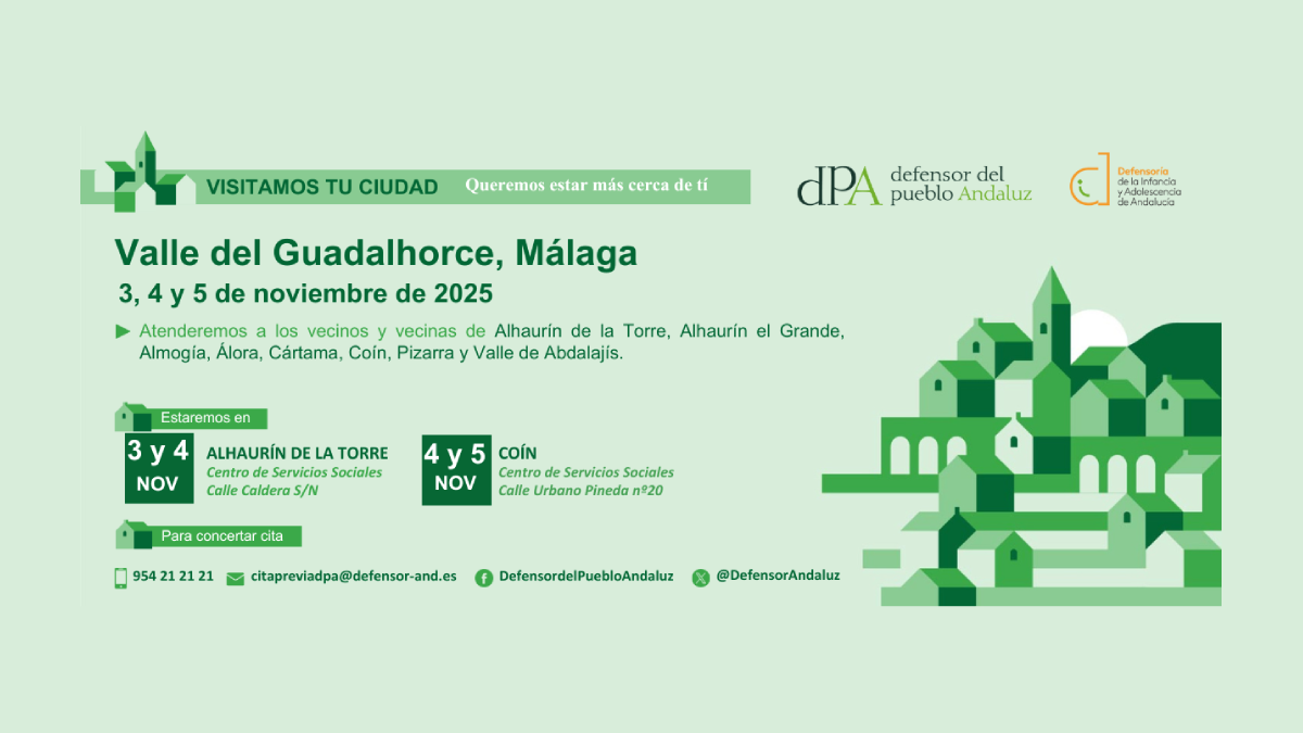 El paso del Defensor del Pueblo andaluz por el Valle del Guadalhorce supone un gesto claro de proximidad institucional y defensa de los derechos. Si resides en la comarca y deseas plantear una consulta, reclama tu cita previa y participa en esta jornada de atención presencial.