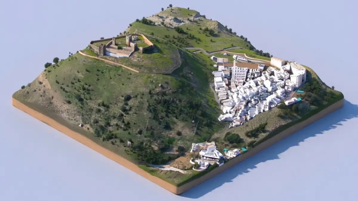La localidad se organiza en torno a un cerro coronado por el castillo, con barrios escalonados y calles en pendientes típicas de un pueblo blanco, rodeada de campos de cereal, olivos, encinares y huertas que ocupan el fondo del valle.