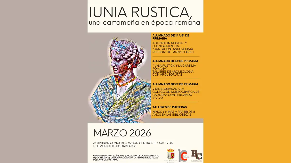Para 1º a 5º de Primaria, el cuentacuentos “Cantacontando a Iunia Rustica” de Fanny Fuguet protagoniza las sesiones en colegios. Los de 6º visitan la Colección Museográfica de Cártama con el cronista Fernando Bravo, seguidos de talleres “Iunia Rustica y la Cartima romana” por Arqueorutas. Incluyen charlas breves, policromía, mitología, frescos y mosaicos romanos, todo concertado con centros educativos locales.