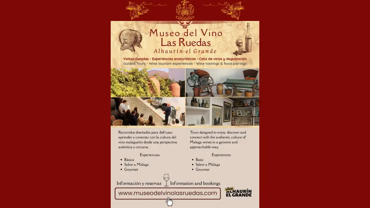El Museo del Vino Las Ruedas resume tradición malagueña en Alhaurín el Grande. Tres rutas, historia familiar y degustaciones esperan. Para guadalhorceños, es patrimonio vivo al alcance. Consulta el Ayuntamiento o sitio web para novedades 2026. ¡Brinda por lo local!