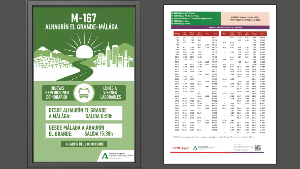 La línea M-167 Alhaurín el Grande – Málaga añade una nueva expedición parcial de lunes a viernes laborables. A partir de este 1 de octubre, los viajeros contarán con: