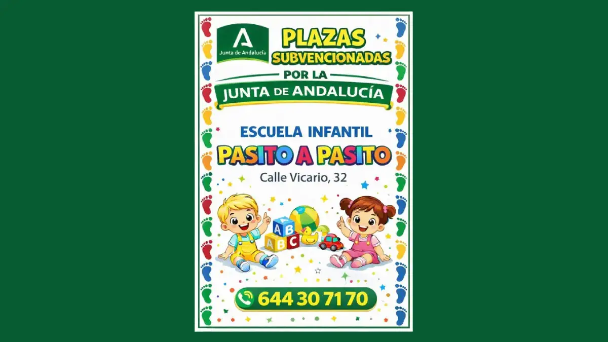 La Escuela Infantil Pasito a Pasito en Coín anuncia plazas subvencionadas por la Junta de Andalucía a partir del curso 2026-2027. Este centro privado, ubicado en Calle Vicario, 32, se adhiere al programa de educación infantil de 0 a 3 años, facilitando acceso a familias del Valle del Guadalhorce.