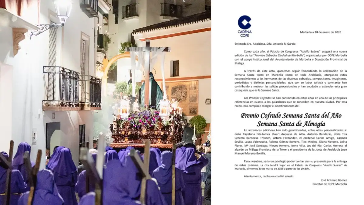 La Semana Santa de Almogía da un paso más en su reconocimiento público y estrena 2026 con una noticia de calado para el pueblo: ha sido distinguida con el Premio Cofrade Semana Santa del Año para Almogía, que concede la emisora COPE Marbella dentro de sus Premios Cofrades Ciudad de Marbella.
