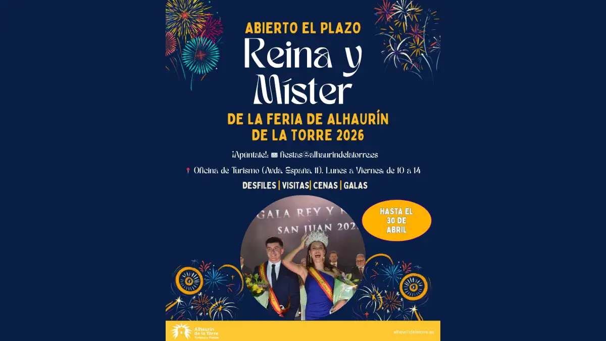 La Concejalía de Fiestas y Turismo de Alhaurín de la Torre ha puesto en marcha el plazo para el concurso de Reina y Míster Feria San Juan 2026. Jóvenes de entre 16 y 28 años, chicos y chicas, pueden ya presentar su candidatura. El objetivo es seleccionar representantes que lleven el espíritu festivo del municipio en desfiles, visitas y cenas. Todo culmina en la gala final el 5 de junio en la Finca Municipal El Portón.